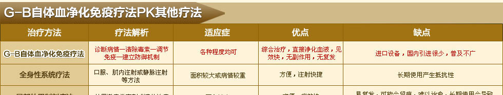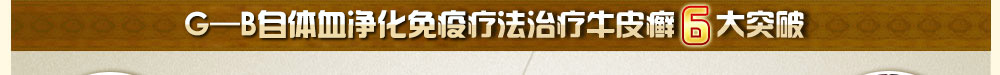 "G—B自体血净化免疫疗法"采用德国进口诊疗设备,快速将变异基因、血毒分离出来,进行围剿清除,使受损细胞得到调节、修复,使血液中的血毒、异变细胞得到彻底净化。同时利用抗原体细胞DC,在不断分化过程中,建立防御和主动攻击变异细胞的体系;将特制中药回输向人体,达到养血润燥、清热解毒、活血化瘀法等功效,使血液得到净化的同时调节免疫,恢复机体平衡,从根本上解决了牛皮癣难题,达到银屑病的临床治愈。