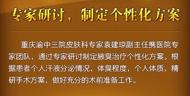 重庆渝中区第三人民医院,国家公立医院,汇聚国内资深皮肤病专家,62年专注皮肤,先后荣获“全国疑难病中西医诊疗定点机构”、“重庆市微创治疗中心”、“全国百姓放心医院”。重庆渝中三院专家分型治疗腋臭,其中以“纳米微创汗腺清除术”治疗腋臭效果最佳,深受广大重庆及周边地区市民一致认可。