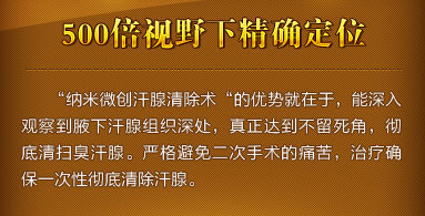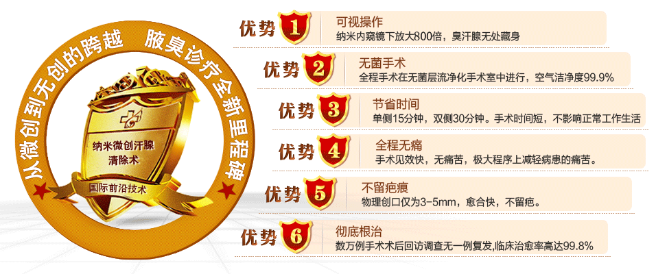 Body odor directional Nano-Clear Technology)是国际腋臭诊疗高端峰会(UT.I.S)推荐的腋臭诊疗技术。 该技术原理是在纳米内窥镜800倍高清视野帮助下,精准定位每一个臭汗腺,并将其有序排出体外。其物理创口大小仅为3mm,几乎无创伤。