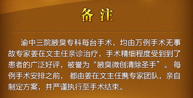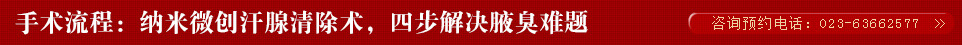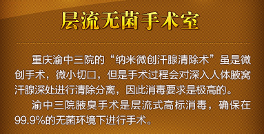 2010年,重庆渝中三院皮肤科率先引入“纳米微创汗腺清除术”并得到此技术西南地区独家认证。“纳米微创汗腺清除术”在2010-2013三年时间内已为数万名腋臭(狐臭)患者解除了臭味困扰,术后回访调查显示临床治愈率高达99.8%。[详情]