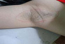 案例三:小门诊做腋臭手术留疤痕--小荷(化名)去年在一家小门诊做腋臭治疗,结果由于术后处理不当,创面发炎感染,愈合期间腋下张力不均,使小荷痛不欲生。